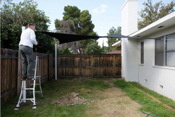 Sun shade sail are constructed of high density polyethylene knitted fabric.Sewn thought the entire perimeter for extra strenth webbing and we use stainless steel "D" or triangle stainless rings in each corner,our shade sails are made of a high rated UV blocking fabric and are sewn with double rows of locking stitches.The cloth is a high density polyethylene knitted fabric that extremely durable and lasts for years in direct sun.Easy for clean up and compact storage. Extra wide fabric is used so there are no seams.Gentle curves along the edges allow for proper tension distribution.